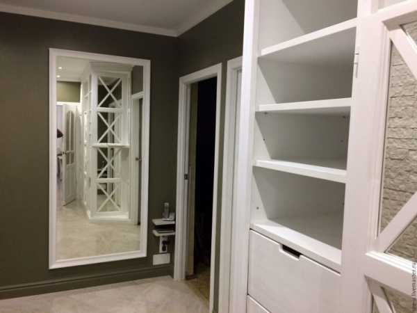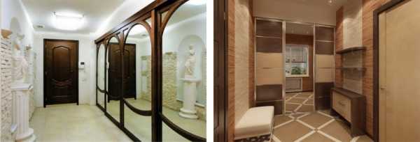 - В мебель. Зеркальное полотно, встроенное в шкаф с вешалкой для одежды, тумбочку для обуви или трельяж, станет очень практичным и удобным оформлением для коридора, так как оно выполняет не только эстетическую функцию, но и является отличным местом хранения.