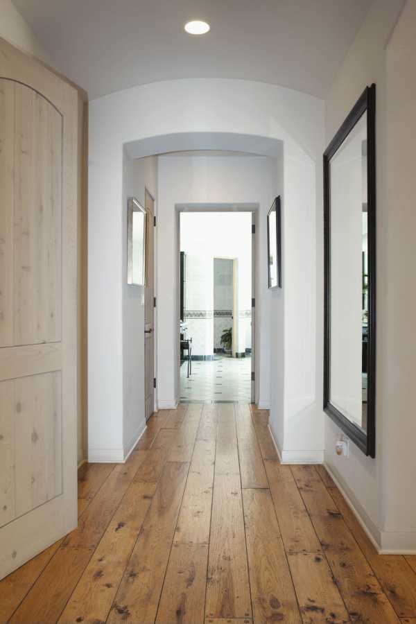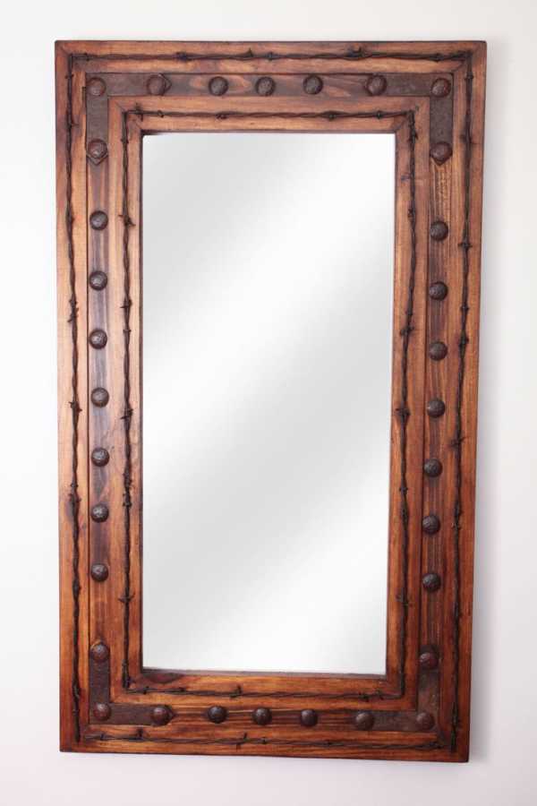 На фото коридор с прямоугольным зеркалом в широкой раме, изготовленной из дерева.