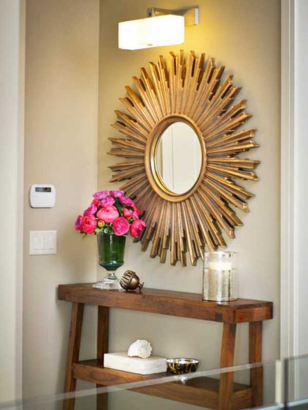 Но не стоит расстраиваться, есть варианты, которые помогут сделать интерьер красивым и удобным. Зеркало в рамке из багета или трюмо стоит недорого, но смотрится стильно, визуально увеличивает пространство. Если площадь помещения ограничена, то оно может быть вставлено в дверцы шкафа. Таким образом, не потребует дополнительного места на стене. Оригинальным решением станет зеркало на входной двери. Такой интерьер всегда выигрышный.