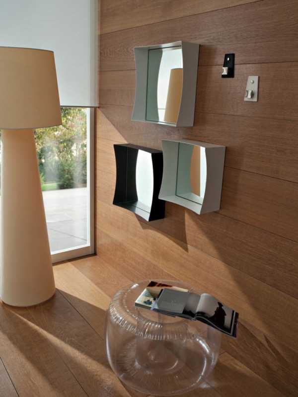 Изогнутые модели в форме волны, полотна в виде солнца, шестигранные соты или другие асимметричные фигуры, станут ярким и динамичным оформлением и предоставят массу возможностей для декора прихожей.