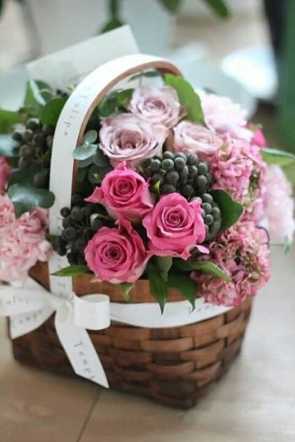 - Еще один чудесный вариант цветочной композиции в корзине. Букеты в корзинке можно создавать из самых разных типов цветов, красиво обыгрывая их.