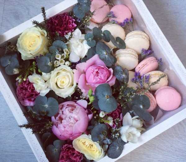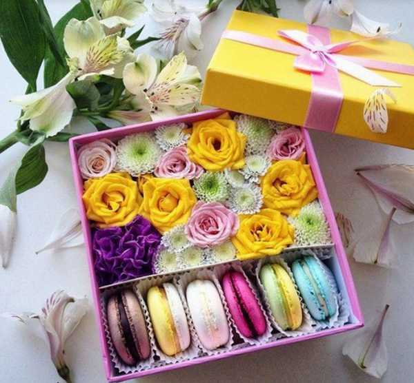 Можно пойти и другим путем. Например, подготовить для презента коробку с двумя отделениями. В одном из них разместить букет, а в другом — подарок или сладости. Отличный вариант — дополнить цветы макарунами.