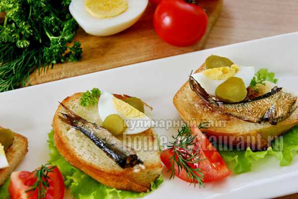 Что касаемо шпрот и другой консервированной рыбы – это далеко не лучший вариант для оформления бутербродов, но даже из них при желании можно «сотворить» красивые бутербродики, дополнив их молодой свежей зеленью – миниатюрными листиками кресс-салата, рукколы или петрушкой. Консервированную сайру, горбушу, тунца не рекомендуется выкладывать на основу кусками, это не добавит эстетичного вида вашей закуски, лучше разомните их вилкой и используйте как начинку для бутербродов с овощами.