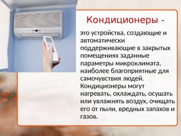 это устройства, создающие и автоматически поддерживающие в закрытых помещениях заданные параметры микроклимата, наиболее благоприятные для самочувствия людей. Кондиционеры могут нагревать, охлаждать, осушать или увлажнять воздух, очищать его от пыли, вредных запахов и газов.