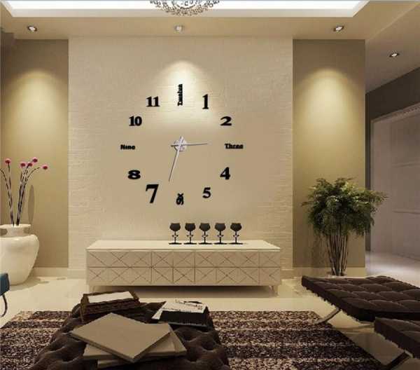В гостиной привыкли вешать настенные часы значительных размеров. Но тут нужно принимать во внимание стиль комнаты.