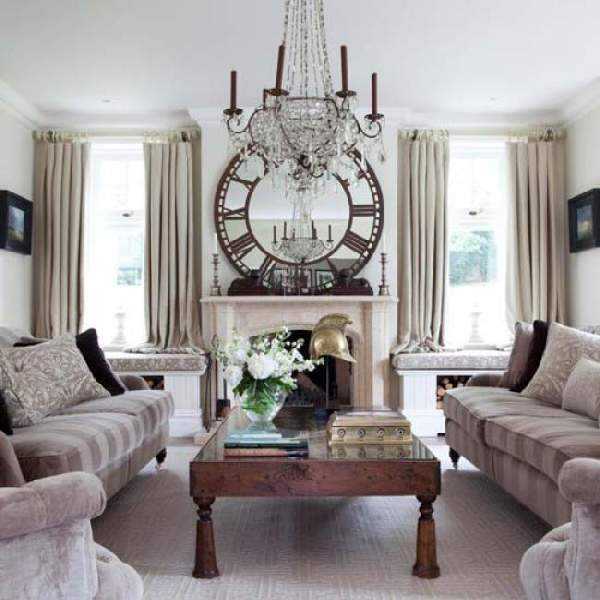 В гостиной часам отводится центральное место: их можно повесить над диваном или камином. Если изделие крупное – нет необходимости дополнять его другими аксессуарами.