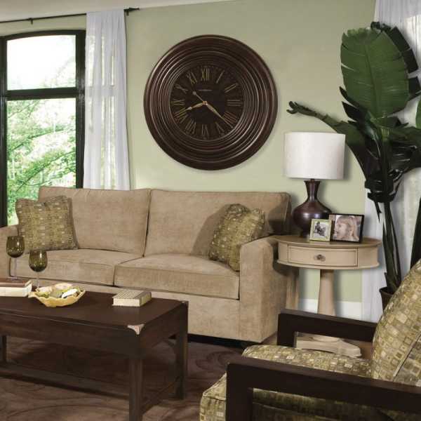 В гостиной необходимо размещать красивые настенные часы, подходящие к интерьеру комнаты, ведь они всегда на виду.