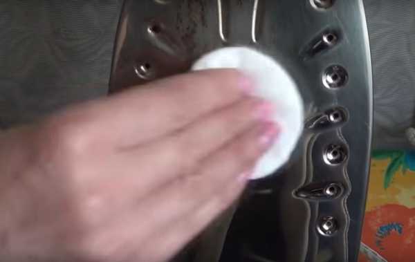 - Убрать нагар от остатков тканей на основе синтетики можно при помощи жидкости для снимания лака или ацетона. Смочите ватку в одной из жидкостей и пройдитесь ею по грязным местам на подошве утюга. После полного исчезновения нагара утюг протирают мокрой тряпкой.
