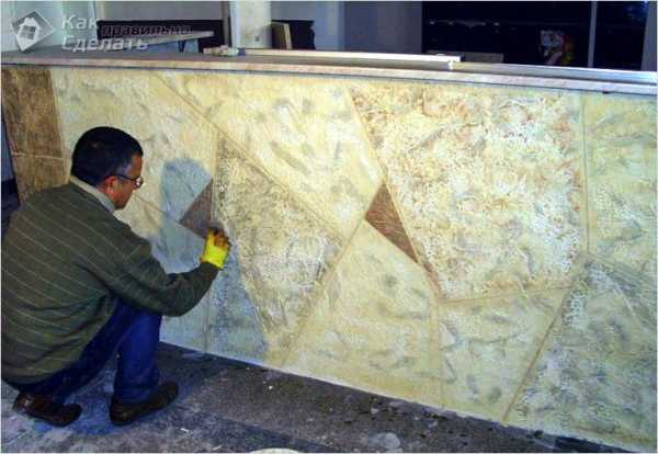 Стены из гипсокартона сначала обработайте грунтовкой. Для приклеивания камня используйте хорошего качества специальный клей. Наносить клей нужно на тыльную сторону декоративного материала, используя зубчатый шпатель.