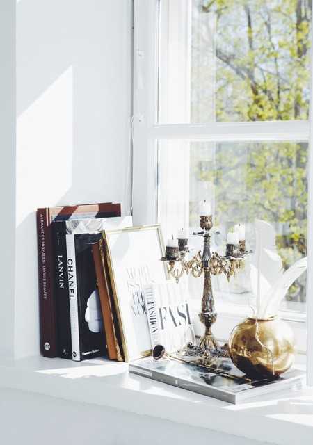Ты поклонница чтения? Тогда этот вариант – для тебя. Но это не значит, что подоконник должен заменить книжную полку или шкаф. Хитрость в том, чтобы обложки сочетались между собой по цвету. Их можно использовать в качестве подставки для других предметов, чтобы в результате получилась многоуровневая, интересная композиция.