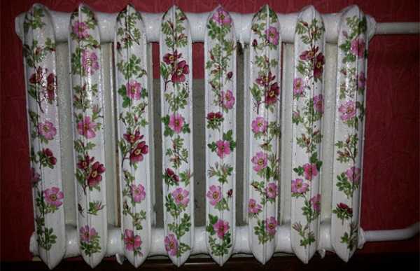 Особый способ украсить батарею — декупаж. В магазинах материалов для рукоделия продаются наклейки на виниловой основе, которые не деформируется под действием температуры. Для декупажа можно использовать не только готовые узоры, но и создать свои из подручных материалов: ткани, бумаги, термоклея и даже бисера.