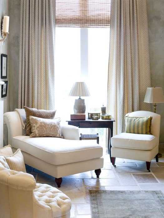 Отличной дизайнерской идеей является размещение двух кушеток возле окна. Такое размещение может сказать, что хозяева любят проводить время вдвоем и наслаждаться видом из окна. Также оригинальное решение – размещение в комнате кресел с различными стилями. Но нужно это сделать так, что бы один стиль дополнял другой. Большие компании будут в восторге от такого интерьера.