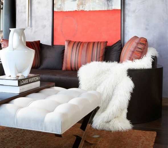 Диван нестандартной формы, который не самым активным образом используется, можно накрыть небольшим меховым покрывалом просто для декоративных целей