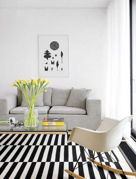 3. Привнесение в интерьер ритма, динамики и визуального объема. Если обстановка вышла однотонной и «плоской», а потому чрезмерно спокойной и даже скучной — коврик с черно-белым рисунком мгновенно исправит ситуацию. Настроение комнаты изменится — она станет более выразительной, эффектной, интересной.
