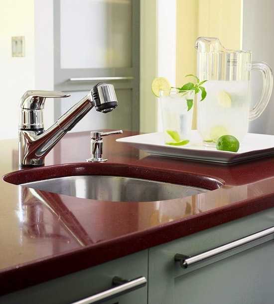 Конгломерат представляет собой сочетание молотого камня со смолой и пигментом. В результате он еще прочнее и в то же время легче гранита. Это не все преимущества конгломератов — они устойчивы к химическим веществам и не обесцвечиваются. Каждый день достаточно их чистить водой, потому что с них легко удалить грязь. Вы также можете использовать другие моющие средства, которые предназначены для чистки кухни.