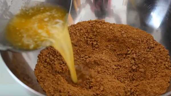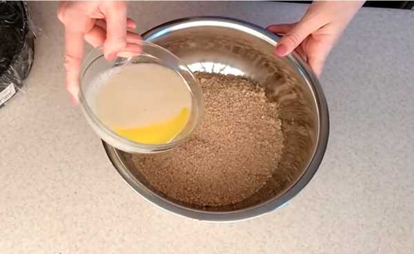 2. Массу вымешать и попробовать скрепить ее рукой – если в руке остается комок, значит, масла будет достаточно. Если же масса все еще рассыпается – лучше добавить еще немного масла, чтобы основа для чизкейка была более плотной и при подаче чизкейка на стол не рассыпалась, а хорошо держала верхний творожный слой.