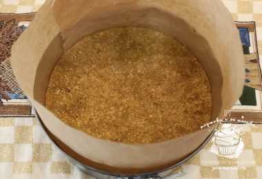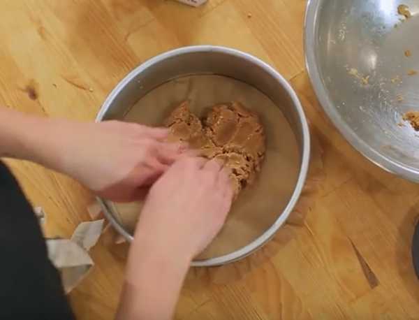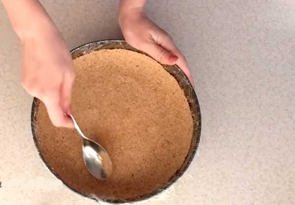 3. Печенье с маслом хорошо утрамбовать в разъемную форму, а борта предварительно обернуть с внутренней стороны пергаментом или пищевой пленкой. Основу поставить в холодильник, чтобы та хорошо застыла.