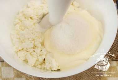 5. Творог переложить в глубокую миску, всыпать к нему сахар и влить сметану (йогурт). Измельчить всю получившуюся массу погружным блендером до кремообразного состояния. Для того чтобы ее добиться, как раз и нужен творог хорошего качества – мягкий, не кислый и не сухой, чтобы все комочки разошлись в сметане или йогурте и масса стала гладкой.
