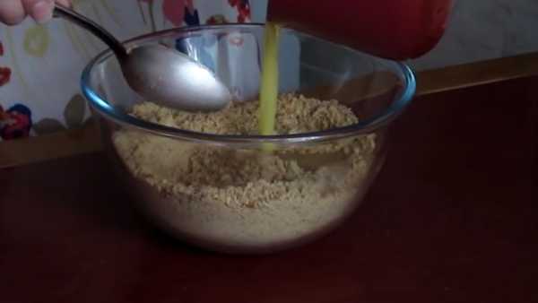 Перемешиваем. Крошка должна полностью впитать в себя масло и стать похожей на мокрый песок.