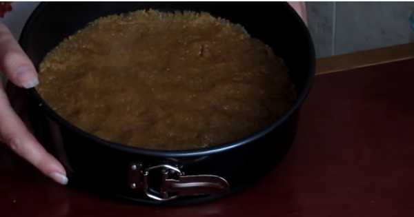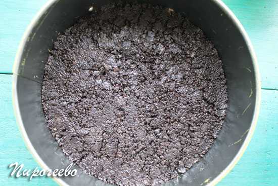 Переложите мокрую крошку на дно формы и утрамбуйте ладонью, чтобы получилась плотная поверхность. Берите форму с разъемными бортами! Я использую форму диаметром 18 см, дно предварительно застелила бумагой для выпечки.