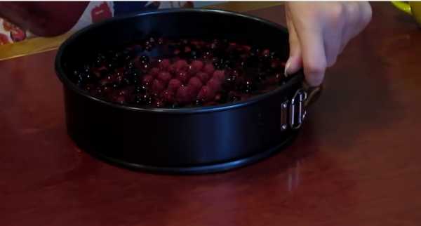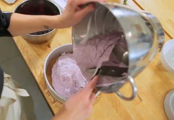 8. Достать охлажденную основу для чизкейка и влить в форму весь крем. Аккуратно перенести все снова в холодильник и оставить на 8-12 часов. Творожно-ягодный слой должен полностью застыть.Когда вы увидите, что творог стал упругим и застыл – можно разъединять бортики формы и снимать пергамент.