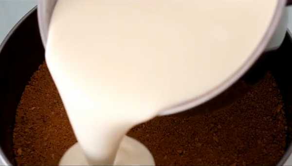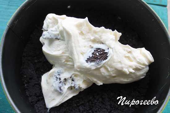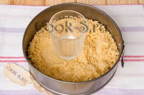 Высыпаем крошку из печенья в форму, её дно предварительно можно выстелить бумагой. Крошку хорошо утрамбовываем. Для удобства берем обычный стакан и проходимся им по всей поверхности, таким образом, крошка превратится в ровный плотный слой – основу чизкейка. Отправляем форму в холодильник.