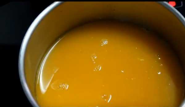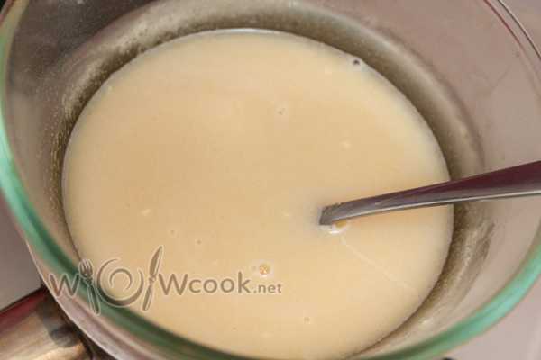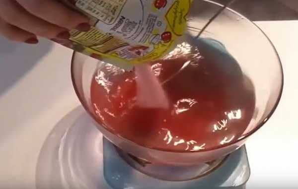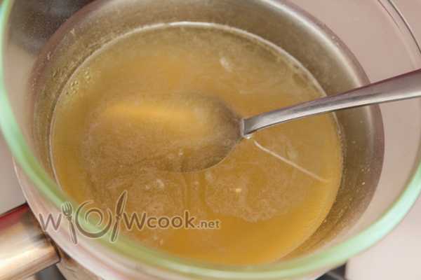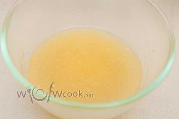 Разбухший желатин прогреваем на плите или в микроволновке. Прогреваем аккуратно, почаще перемешивая и ни в коем случае не доводим до кипения! Желатин должен полностью раствориться. Полученному раствору даём чуть остыть.