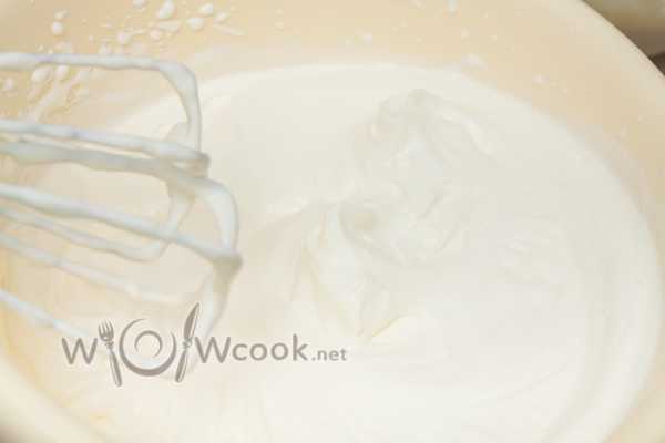 В отдельной миске взбейте 130 г жирных сливок до мягких пиков. Не стоит работать миксером слишком упорно, так можно превратить сливки в масло.