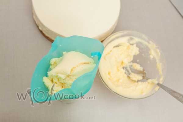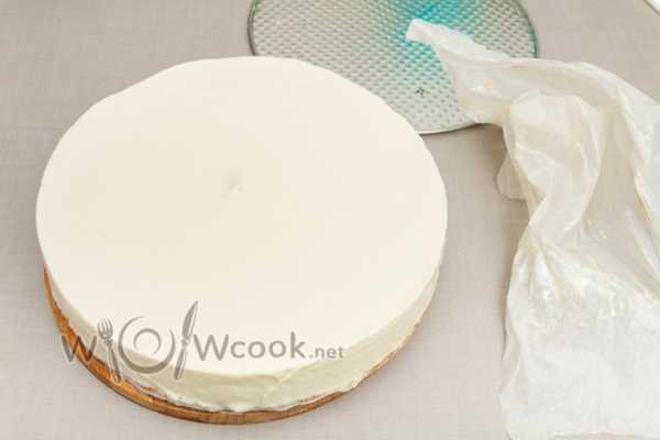 С помощью силиконового наконечника выровняйте поверхность как можно лучше и снова уберите чизкейк в холодильник.