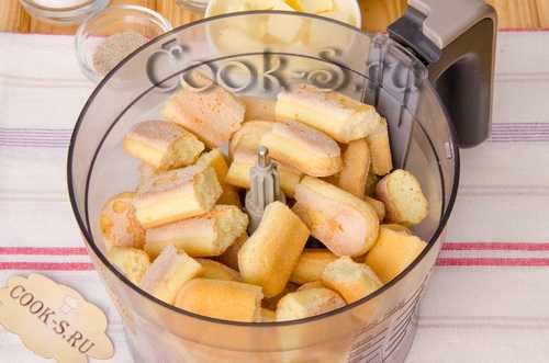 Сначала превратите печенье в крошку: разломите на половинки и поместите в чашу блендера. Пару нажимов — и крошка будет готова.