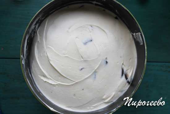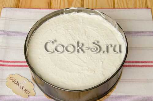 Форму достаем из холодильника и наполняем её сырно-сливочной массой. Кстати, бока формы для удобства можно выстелить полосками бумаги или специальной кондитерской плёнкой, тогда чизкейк будет проще освободить от бортов формы. Отправляем чизкейк в холодильник на 3-4 часа.