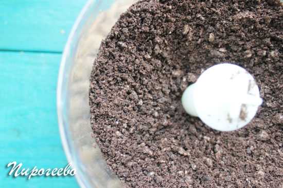 Готовим песочный слой. Готовое печенье измельчаем любым возможным способом в мелкую крошку. Проще всего это сделать комбайном, но за неимением его, можно воспользоваться мясорубкой или старым добрым способом – пакетом и скалкой.