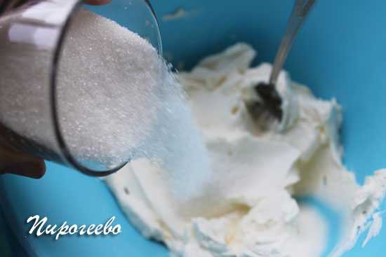 Приготовим сырный слой. Жирные сливки переливаем в глубокую миску. Высыпаем в неё же сахарную пудру и ванильный сахар. При взбивании сливок следует помнить, что хорошо взбиваются только холодные сливки, поэтому перед взбиванием сливки обязательно нужно держать в холодильнике, а также можно дополнительно охладить миску для взбивания и венчики миксера.