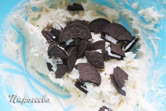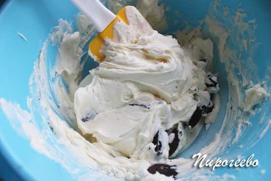 Аккуратно с помощью лопатки перемешайте сливочную массу с печеньем.