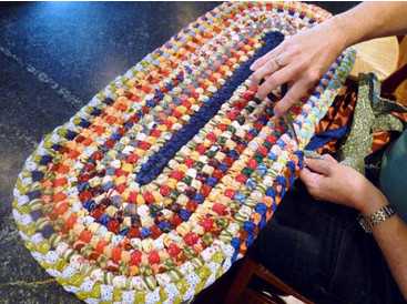 Для создания такого красочного коврика нужно нарезать простыню на мелкие полоски, скрутить из них много косичек и прикрепить к основе. Работа немного трудоемкая, но результат шикарный!