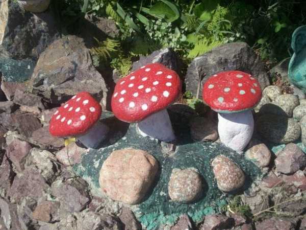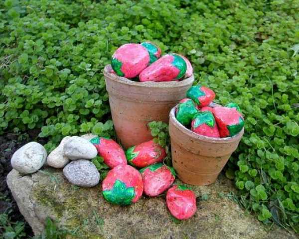 Если проявить немного фантазии, то на участке или в саду вырастут сказочные грибы или распустятся ромашки. Эффектно будут выглядеть горшочки или ведерки с камнями, которые раскрашены в виде ягод.