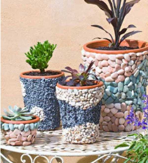 Можно украсить цветочные горшки или кашпо. Для этого понадобится хороший клей, камни, горшки, которые необходимо обработать обезжиривателем для того, чтобы фиксация была более надежной.
