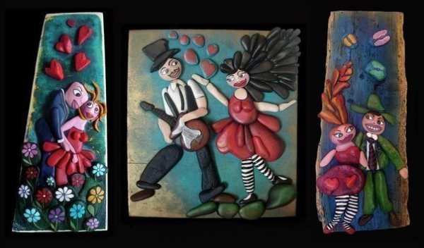 Собрать композицию удобно на деревянных дощечках, кусках плотного картона, керамической плитке. Если закрепить их рядом на стене, то получится, например, целый триптих. Веселый, жизнерадостный, оригинальный, никто не пройдет мимо, он обязательно обратит на себя внимание.
