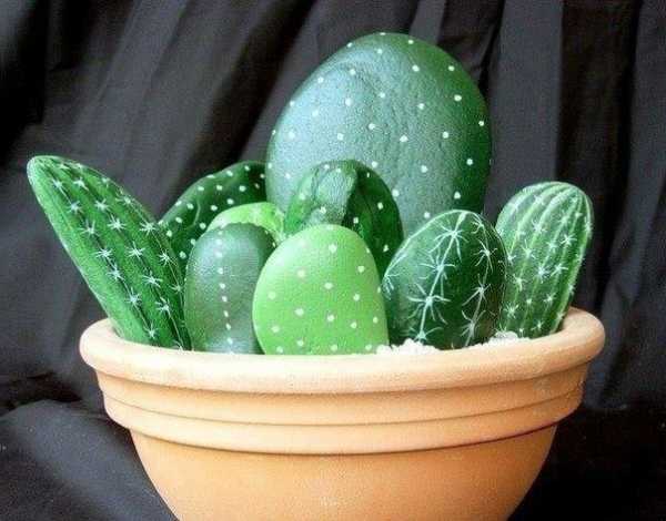 Отличным занятием не только для взрослых, но и ля детей, станет роспись гальки. Для росписи камней необходимо использовать акриловые краски или гуашь. Конечно, акриловые краски будут более долговечными, а если рисунок покрыть сверху лаком, поделка будет радовать глаз не один десяток лет. При помощи росписи гальки интерьер помещения можно украсить симпатичными кактусами. Для такой поделки понадобится галька больших размеров, которую следует раскрасить в виде кактусов. Цветочный горшок заполнить мелкой крошкой и поместить в него получившиеся «кактусы». Таким образом, в один горшок можно поселить один «кактус» или целую «зеленую семейку».