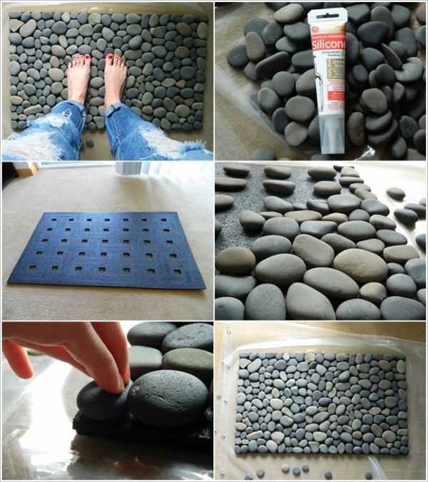 Сделать каменный массажер проще всего, взяв за основу любой резиновый коврик. Приклеивать гальку нужно прозрачным водостойким клеем, подбирая элементы так, чтобы не было видно непривлекательной резины.