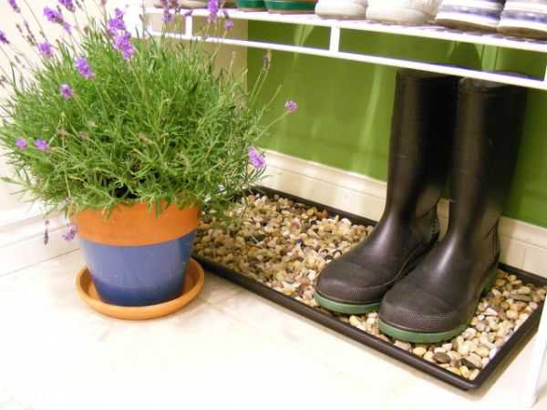 По этой же схеме можно сделать обувную подставку. Она не просто оживит интерьер, но и поможет организовать уголок для хранения обуви. Не обязательно эту подставку нужно приклеивать к основе, можно просто насыпать камешки небольшим слоем в мелкий лоток.