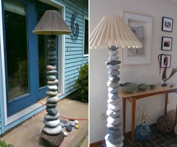 Скучный торшер можно превратить в настоящее произведение искусства с помощью крупных округлых камней, их прийдется просверлить и нанизать на на ножку светильника, предварительно его разобрав. Предпочтительно использовать камни большего размера внизу, это придаст конструкции устойчивость.