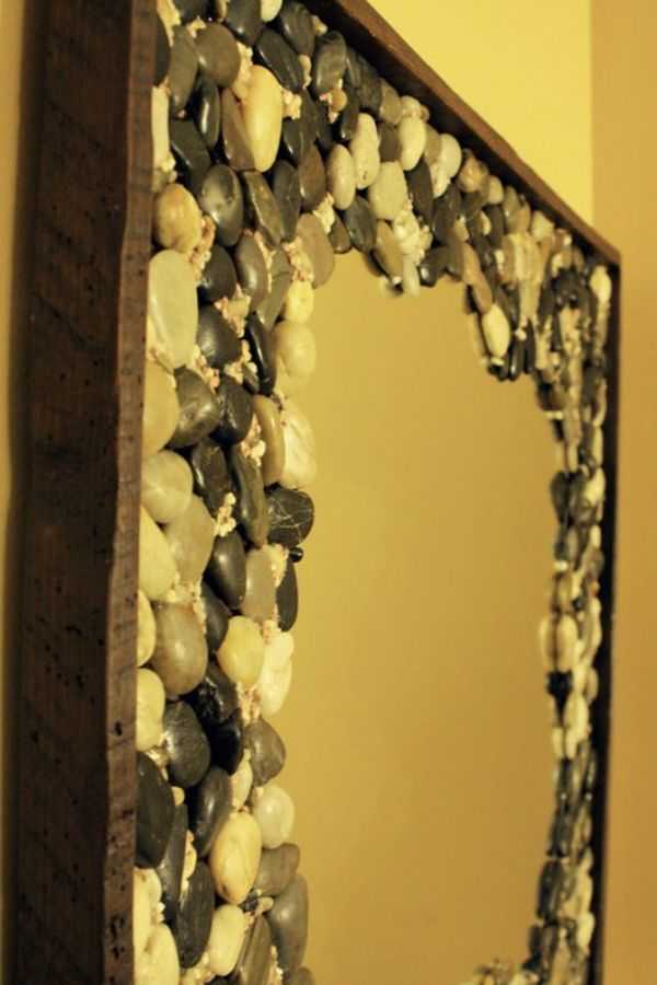 Очень стильное интерьерное зеркало в деревянной оправе получится, если декорировать его камешками разного размера, можно также использовать ракушки и совсем мелкую каменную крошку для заполнения пространства между более крупными камешками.