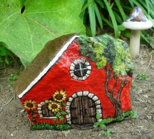 При помощи камня декорируют фонтаны, обустраивают террасы, оформляют садовые дорожки, и, даже, сооружают мебель. Но чаще всего из камня делают поделки, которые становятся украшением сада или приусадебного участка. Отлично украсят сад камни разной величины, которые разукрашены в виде божьих коровок. Если проявить фантазию, то из камней могут получиться симпатичные гусеницы, улитки, лягушки и другие милые жители сада.