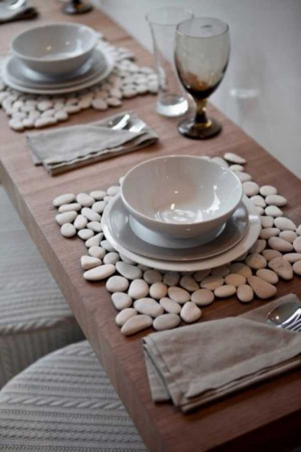 Очень интересное решение, которое вполне может послужить отличным подарком для дома, сделанным своими руками – подставки под горячее. Чтобы такие подставки не повредили поверхность, камешки следует наклеивать на основу, в качестве которой прекрасно подойдут обычные дешевые салфетки под горячее из ближайшего супермаркета.