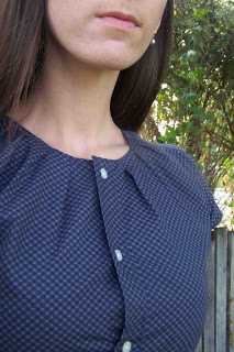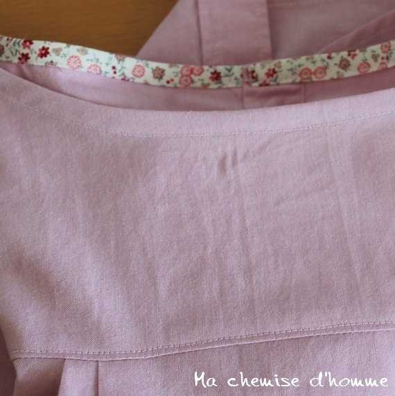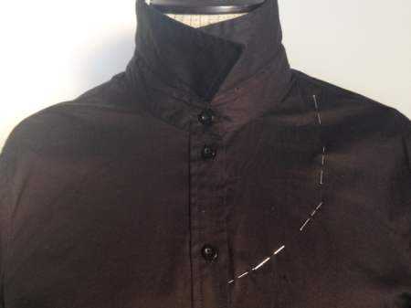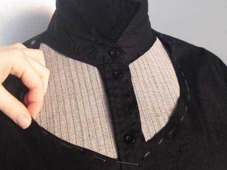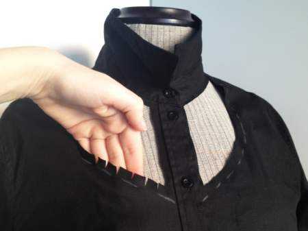 Горловина – ещё одна трудность при переделке мужской рубашки. Не для всех, конечно, и не во всех случаях появляется, но тем не менее. Если у вас вырезанная горловина окажется большой и будет отставать от шеи, не дёргайтесь и не пытайтесь забрать лишнее в плечевой шов – только возьни прибавится. Выход здесь один: собрать-заложить по вырезу небольшие складочки по обе стороны от застёжки