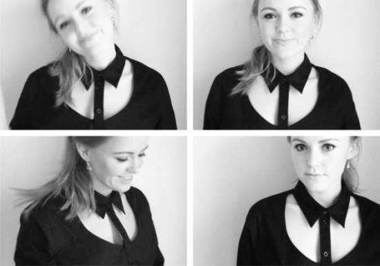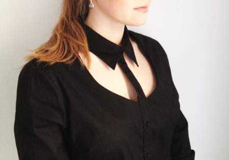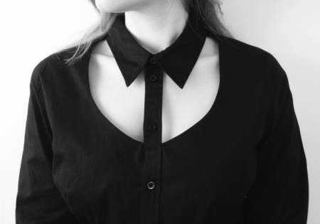 Мода на воротнички задала тренд рубашки, с вырезом на груди так, чтобы воротничок выделялся. Смотрится необычно и стильно одновременно. Необязательно использовать блузку черного цвета, подойдут любые оттенки и ткани.