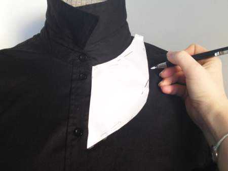 После того, как вы отметили отверстие на одной стороне рубашки, переведите рисунок на бумагу. Положите ее на противоположную сторону рубашку, чтобы вырез получился симетричным. Обведите мелом.
