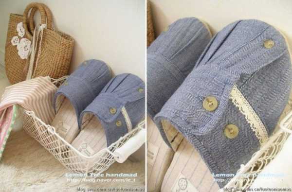 Из старых рубашек получаются весьма оригинальные и стильные комнатные тапочки. Такая переделка позволит убить сразу двух зайцев: разгрузить шкаф от ненужных вещей и обзавестись несколькими парами тапочек для гостей.