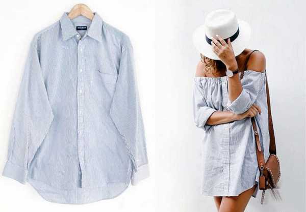 Обзавестись стильным коротким платьем свободного кроя с открытыми плечами можно буквально за копейки. Для его создания вам потребуется классическая мужская рубашка, от которой нужно отрезать верхнюю часть и вшить резинку.